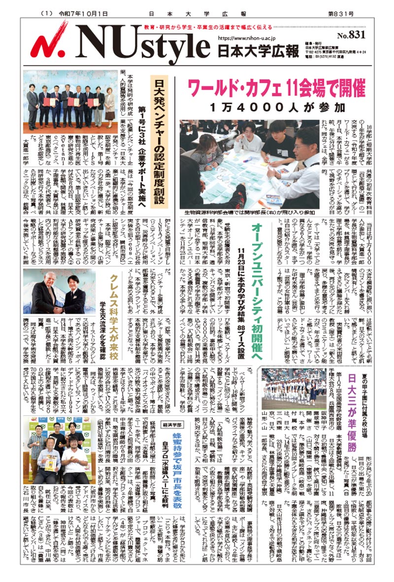 最新情報 2025.10.09 入学者選抜実施(10月11日)に伴う窓口業務の休業について 10月11日(土)は入学者選抜実施に伴い、窓口業務を休業といたします。 最新情報 2025.10.09 「機械工学モノづくり工房モビリティデザイン部会」活動の軌跡を追う! 一歩一歩成長を遂げるモビリティデザイン部会!今後の活躍に期待も高まる! […] 最新情報 2025.10.09 建築学科 辻村准教授が自動車技術会「2024年度技術部門貢献賞」を受賞しました この度、建築学科 辻村壮平准教授(写真右)が公益社団法人自動車技 […] 最新情報 2025.10.08 広報紙「日本大学広報NUstyle 10月号」を発行しました 日本大学本部広報部広報課からのお知らせです。 […] 一覧を見る