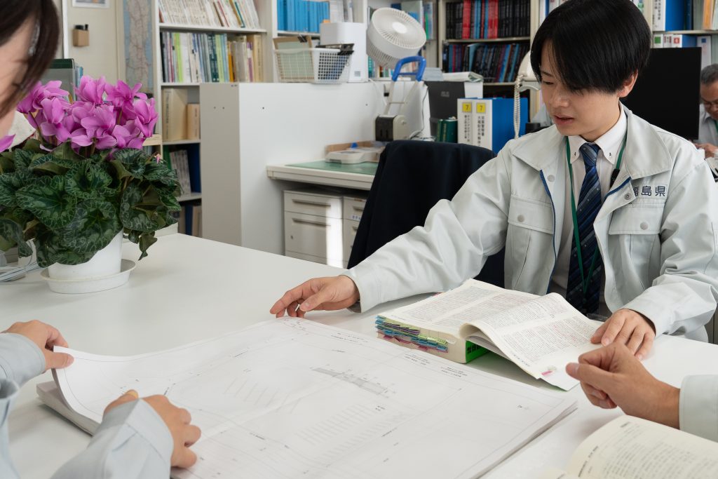 現在は福島県庁建築事務所の建築住宅課で働いており、建築基準法に関わる許認可審査や建築相談といった指導審査業務を担当しています。