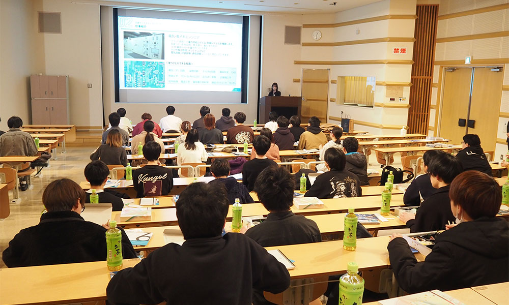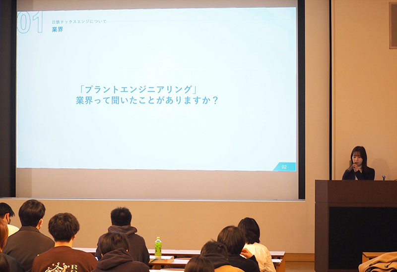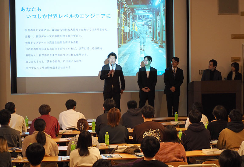 12月23日(火)、土木工学科・建築学科・機械工学科・電気電子工学科・情報工学科を対象に、『OBによるランチタイム企業研究会』が行われました。工学部では、昨今の物価高騰によって経済的に厳しい状況にある学生たちを支援するため、協賛企業と協力して昼食を提供する取り組みを続けています。ランチタイムを活用した企業セミナーは、昨年度より土木工学科が始めたもので、お弁当を食べながら自身のキャリア選択の参考になる話も聞けるということから、人気のセミナーになっており、徐々に他学科にも広がっています。今回は、日鉄テックスエンジ株式会社様にご協賛いただきました。同社は、鉄鋼メーカーのプラント(生産ライン)を構築する国内有数のエンジニアリング会社です。現在、工学部の卒業生60名が様々な部署で活躍しています。当日は3名の卒業生が参加し、それぞれが携わっている製鉄所での現場監督や施工管理業務について説明するとともに、入社の動機や就活に関するアドバイスなどを話してくれました。