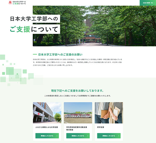 日本大学工学部は、人と地球の未来をつくる若い力を育成し、社会へ貢献することを目指した教育・研究活動に取り組んでいます。ぜひ多くの皆さまからのご支援、ご協力を心からお願い申し上げます。