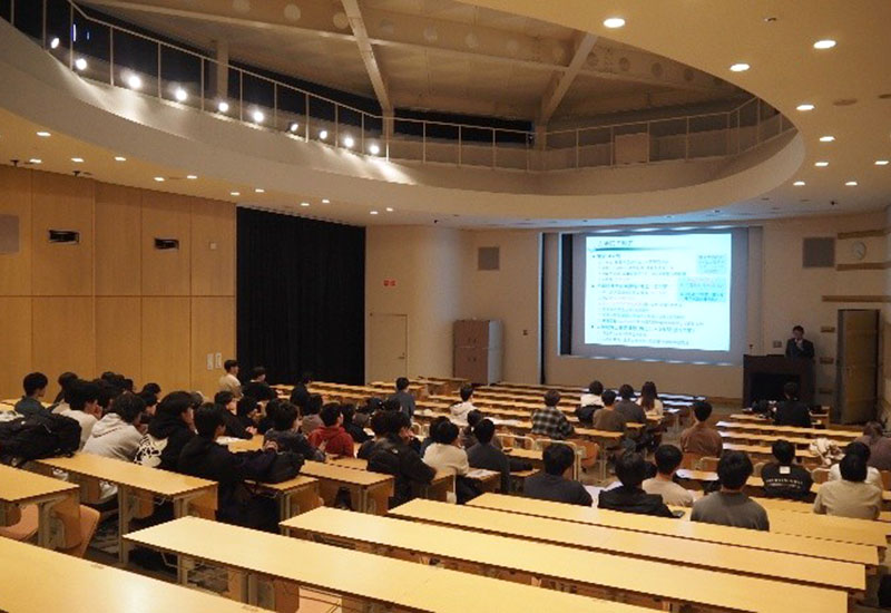 はじめに、学科主任の石川博康教授が大学院の概要、メリット、カリキュラム、奨学金制度などについて説明しました。メリットとして、自分のやりたい研究ができることや学会活動を通じてコミュニケーション力を高められること、大手企業からの推薦を獲得しやすく就職活動に有利であること、初任給が高くなることなどを挙げました。奨学金などのサポートも万全だと伝えました。