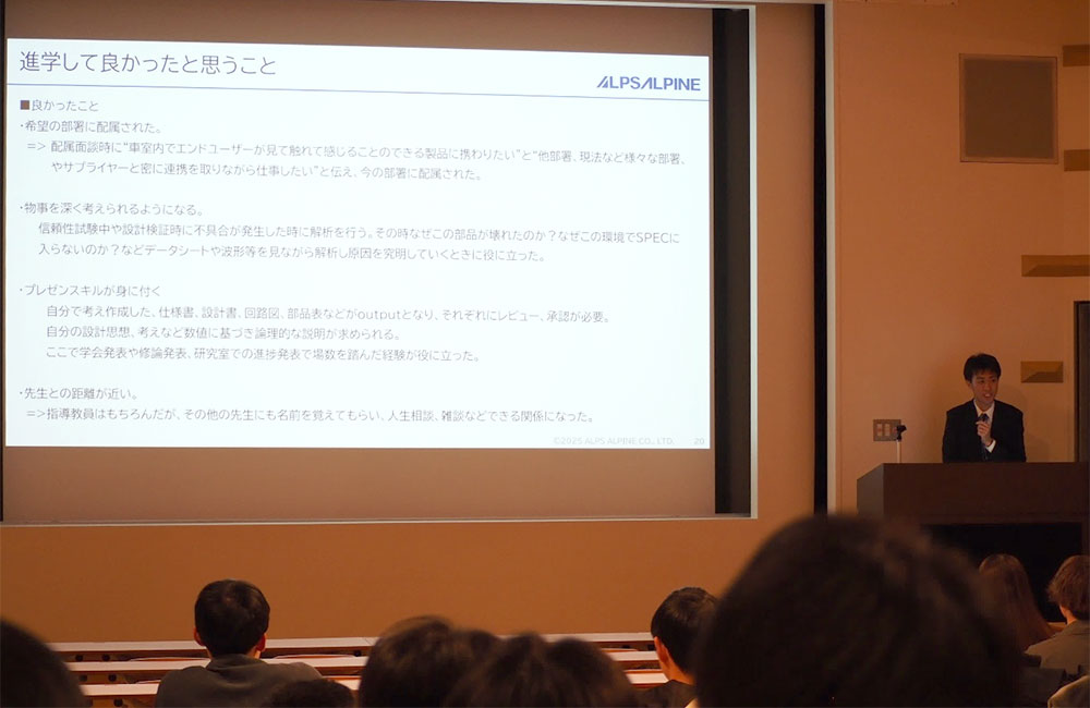 最後に、アルプスアルパイン株式会社に勤務する栁沼 祐さん(2019年度修了/制御工学研究室)が登壇。大学院進学を決意した経緯について、学部時代に留年したことで卒業後の進路について真剣に考える時間があり、大好きな自動車関連の製品開発に携わりたいと思ったことがきっかけだったと話しました。就職後に感じた大学院のメリットとして、初任給が学部卒より高く(学部卒26.9万円、院卒29.4万円)、生涯年収で約5,000万円の差がある、希望の部署に配属されやすい、専門性が深まるので転職時にもキャリア形成の幅が広がることを挙げました。また、大学院進学は楽な道のりではないが、自分のやりたいことを実現するために必要な時間だったと話しました。最後に、会社や現在の仕事、自身が設計開発に携わった製品についても紹介し、仕事のやりがいを熱く語ってくれました。