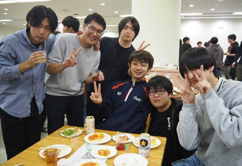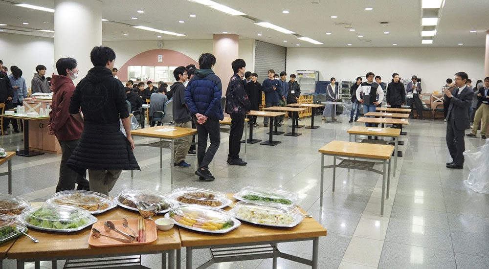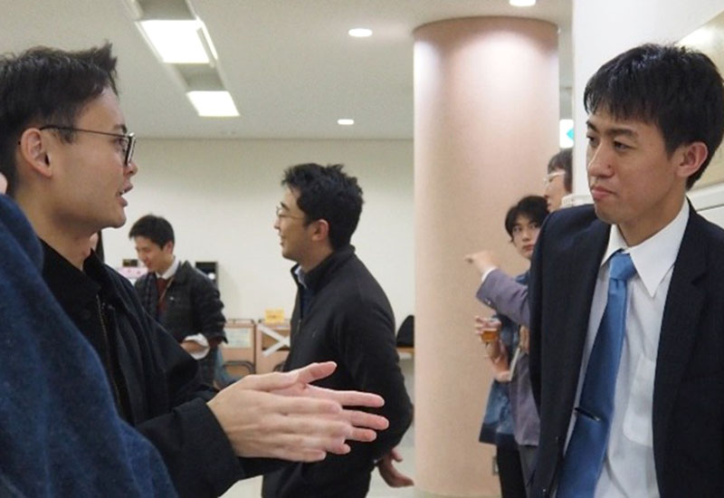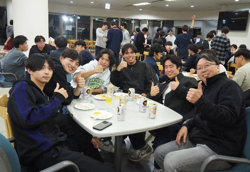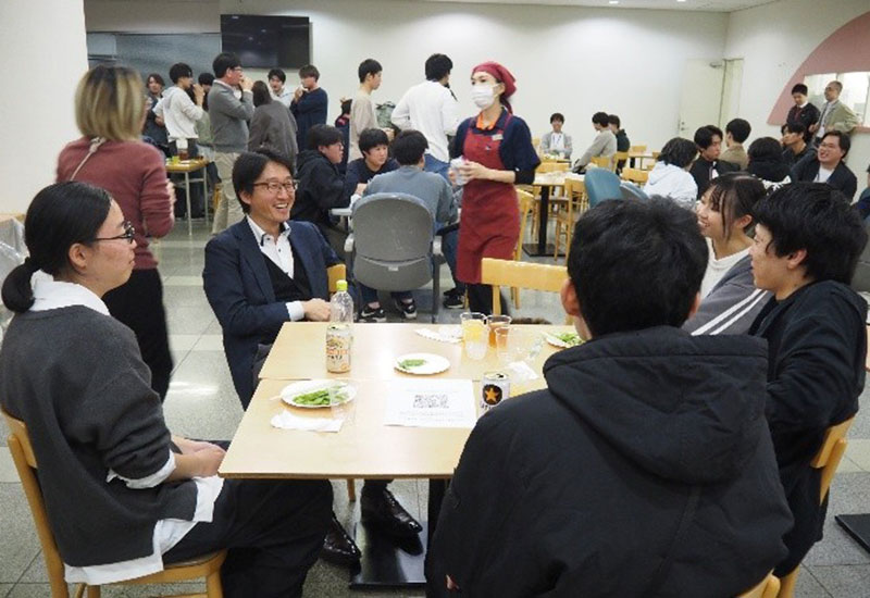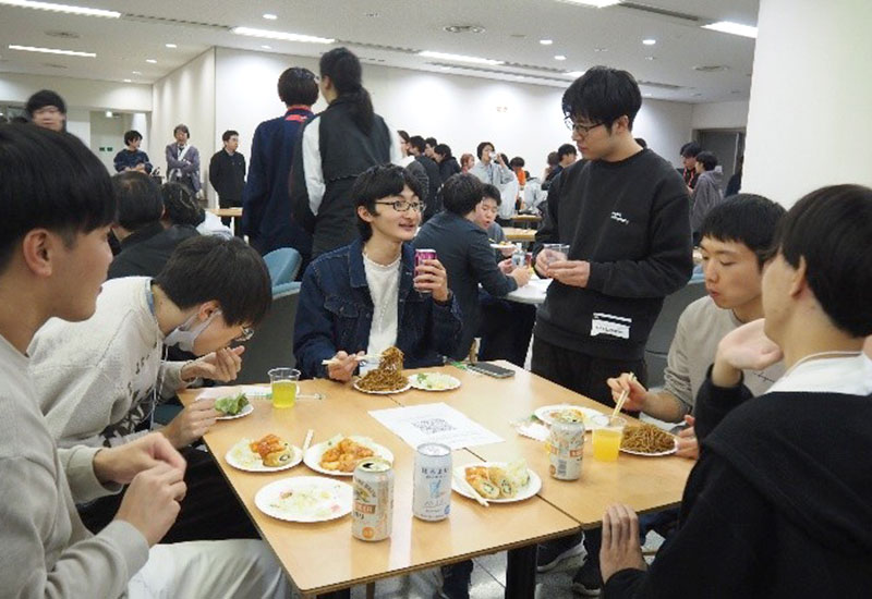 講演の後には、ハットNE2階カフェテリアで大学院生と学部生の懇談会が行われ、大学院生に直接質問や相談ができる場も設けられました。和やかな雰囲気の中で歓談しながら、リアルな大学院生活や研究室の様子を聞いたり、就職の相談や悩みを打ち明けたりするなど、学生たちは学年の垣根を越え本音で語り合っていました。電気電子工学科の教員も学生に交じって談笑する場面が多く見られ、同学科の良さでもある「先生とも気軽に話ができる距離の近さ」が伝わってきました。