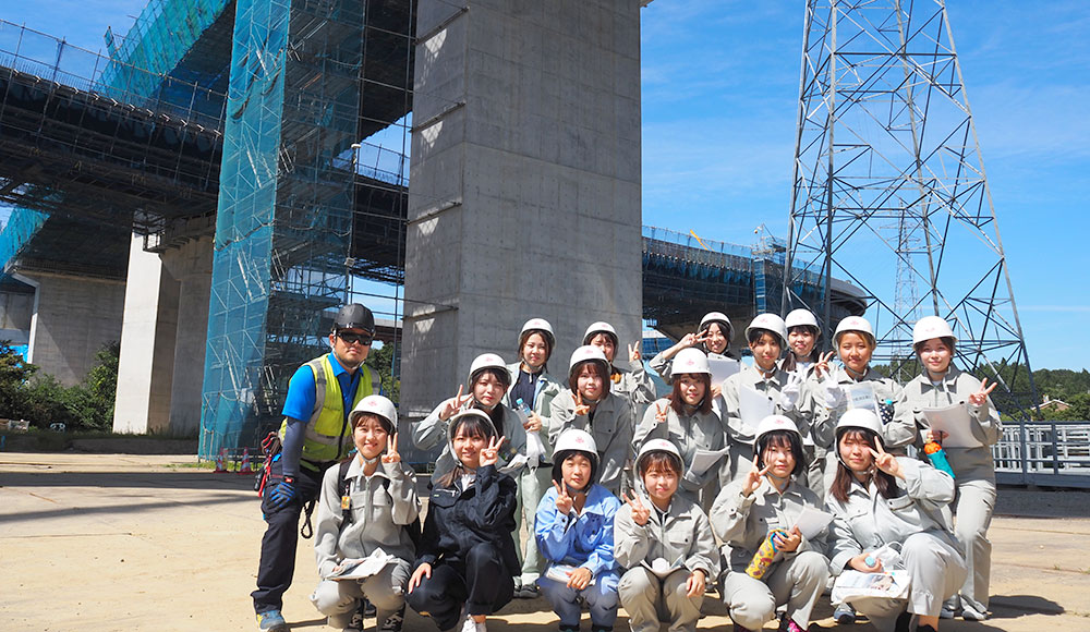9月14日(水)、土木女子の会に所属する1年から3年までの学生16名が、『ふくしま復興再生道路』吉間田滝根線の県道バイパス工事の現場を見学しました。福島県は東日本大震災後、中通りと浜通りを結ぶ主要8路線を『ふくしま復興再生道路』と位置付けて整備事業を行っています。今回は、「復興まちづくり・交流ネットワーク基盤強化プロジェクト 」 に位置づけられ、浜通りと中通りをつなぐ重要な道路となっている吉間田滝根線(広瀬工区)の橋梁上部工の架設工事を行っている現場を見学させていただきました。広瀬工区はあぶくま高原道路小野 ICから小野富岡線までの9.2kmの道路です。橋梁を走行する車の荷重を支えるコンクリート床版がどのようにつくられているのか、実際に見られる機会はなかなかないので、貴重な体験です。さらにこの橋梁には、土木工学科の子田康弘教授が企業との共同研究で進めている高耐久性床版を使った実構造物での実証実験が行われる現場とあって、学生たちも大変楽しみにしていたようです。