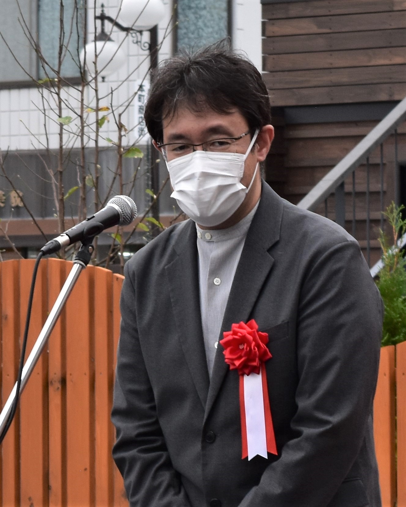 ・開式の辞にあたり、ご挨拶された菊池医院の菊池信太郎院長は、「ロハスの考えを取り入れた持続可能な地域や環境を子どもたちにも見せたいという思いも含めた施設になっている。これを第一歩として、本町の再活性化につなげていきたい」と新たな決意を述べられました。続いて、ご来賓の品川萬里郡山市長がご挨拶され、「様々な課題に直面している子どもたちの個々の健康だけでなく、郡山市全体の健康をリードしてほしい。そして、プロジェクトが大きな花を咲かせることを願っている」と祝意を表されました。次に、来賓として挨拶した岩城教授は、「震災後からこれまで、菊池先生と思いを共有し、ロハス工学の視点から下支えしてきた。今後も福島の子どもたちを日本一元気にするために協力していきたい」と抱負を語りました。プロジェクトの代表の一人として挨拶した浦部教授は、SDGsを推進する郡山市のまちなかに、SDGsにも深く関係する“木”を使った『ロハスの新しいデザイン』を実践した意義を強調しながら、「これからもプロジェクトメンバーと関わりを深め、多面的に協働できれば」と述べました。その後、株式会社はりゅうウッドスタジオの滑田崇志社長と陰山建設株式会社の陰山正弘社長もご挨拶され、プロジェクトに関われたことへの感謝と喜びの言葉を述べられました。