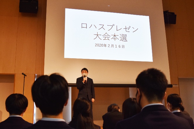 ・2021年度より、日本大学東北高校と日本大学工学部との高大連携をさらに進め、工学部への進学も視野に入れた『ロハスクラス』がクラウド上に新設されました。昨年9月には、工学部と連携して『ロハス探究活動』がスタート。『ロハス探究』は、生徒たちが探究班を形成し、身近なところから課題を見つけ、主体的に議論を交わしながら、その課題を解決する目的で設置された授業です。工学部の各学科の教員がファシリテーターとして生徒たちをサポートするとともに、工学部の研究室で演習や実験なども行いました。生徒たちが自ら考えた課題解決策を発表する『ロハス探究プレゼンテーション大会』には39チームが参加。zoomによる審査の結果、各学科を代表する7チームが選ばれ、2月16日(水)の本選に出場しました。会場となった日本大学東北高校新校舎のSAKURAホールには、Iコース2年理系選択者約200名が集まり、1年生全員が各教室や個人のzoomでライブ参加しました。工学部からは根本修克工学部長と浦部智義学務担当が参加。緊張感が漂う中、発表者の熱のこもったプレゼンテーションに教員や生徒も真剣に耳を傾けていました。
