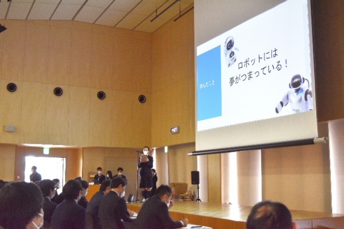 ・2021年度より、日本大学東北高校と日本大学工学部との高大連携をさらに進め、工学部への進学も視野に入れた『ロハスクラス』がクラウド上に新設されました。昨年9月には、工学部と連携して『ロハス探究活動』がスタート。『ロハス探究』は、生徒たちが探究班を形成し、身近なところから課題を見つけ、主体的に議論を交わしながら、その課題を解決する目的で設置された授業です。工学部の各学科の教員がファシリテーターとして生徒たちをサポートするとともに、工学部の研究室で演習や実験なども行いました。生徒たちが自ら考えた課題解決策を発表する『ロハス探究プレゼンテーション大会』には39チームが参加。zoomによる審査の結果、各学科を代表する7チームが選ばれ、2月16日(水)の本選に出場しました。会場となった日本大学東北高校新校舎のSAKURAホールには、Iコース2年理系選択者約200名が集まり、1年生全員が各教室や個人のzoomでライブ参加しました。工学部からは根本修克工学部長と浦部智義学務担当が参加。緊張感が漂う中、発表者の熱のこもったプレゼンテーションに教員や生徒も真剣に耳を傾けていました。