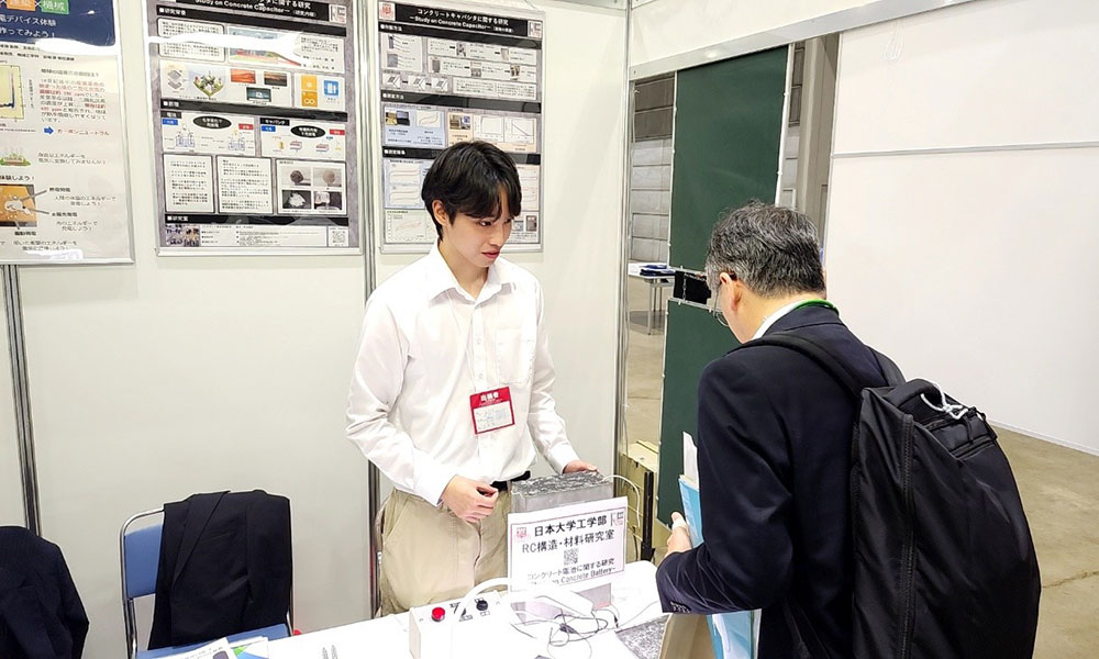 建築学科のサンジェイ・パリーク教授、電気電子工学科の江口卓弥専任講師よりコンクリート蓄電デバイスに関する研究成果が出展されました。異分野の知見を融合した挑戦的な研究テーマで、展示会では太陽電池でコンクリート蓄電デバイスに充電しライトを点灯させる実演を披露。実用化を視野に入れた意欲的な研究として注目を集め、会場では多くの来場者が足を止め、活発な意見交換が行われました。
