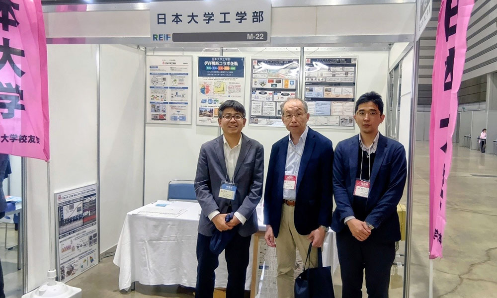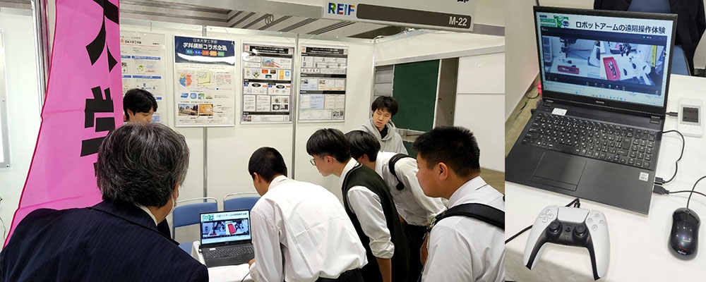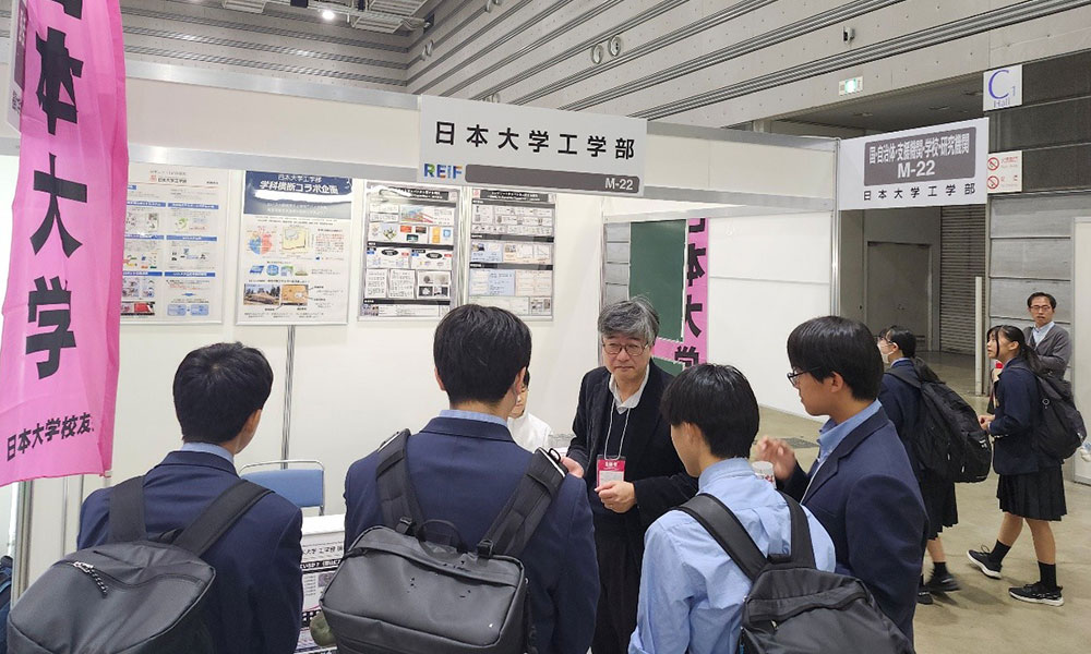 2025年10月16日(木)・17日(金)に第14回ふくしま再生可能エネルギー産業フェア(REIFふくしま2025)が開催されました。国内外から158の民間企業及び自治体、公的研究機関、大学が再エネ・水素の地産地消・産業集積をカーボンニュートラルの実現にむけた成果が出展されました。工学部からは従来有志で参加しておりましたが、今年から工学部として正式に参加することとなり、電気電子工学科、生命応用化学科、機械工学科、建築学科の各分野が取り組む最新の研究成果を出展しました。日大工学部ブースには2日間で210名の来場者の方に足をお運びいただきました。来訪された方の中には、椎根健雄郡山市長含む郡山市、福島県関係者の方々に加え、日本大学を卒業された校友の皆様、ロハス工学に興味を持っていただいた一般の方々、さらに二本松実業高校、福島高校、白河実業高校、郡山東高校等から見学に訪れたの多くの高校生の方々が含まれており、“福島、郡山を共に発展させていきましょう”、“日大工学部志望考えています”等多くの期待や嬉しい言葉をいただくことができました。