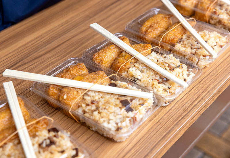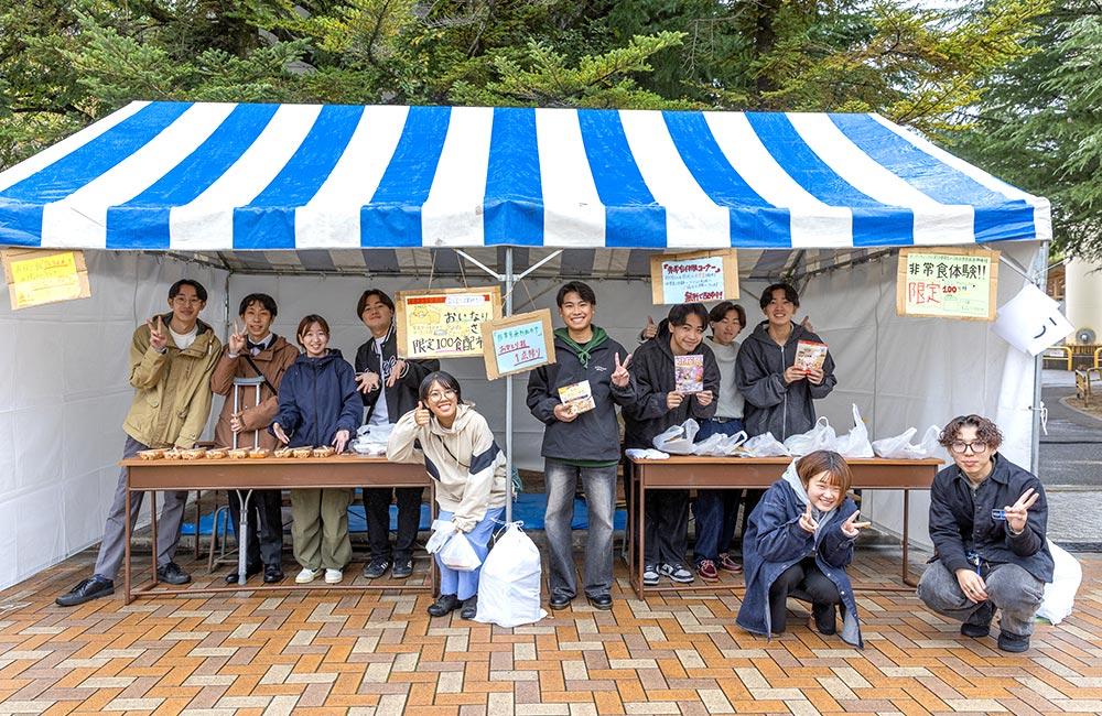 農薬や化学肥料に頼らない環境にやさしい循環型農業として、学内でさつまいもの自然栽培を行う「ロハスの畑プロジェクト」で栽培したさつまいもと、食べてフードロスを削減するとした「防災備蓄品の賞味期限切れによるフードロス削減プロジェクト」の災害備蓄米を使用した、コラボ企画「さつまいもごはん」をつくり、各日100食を配布し、好評だったためあっという間に配布終了となりました。