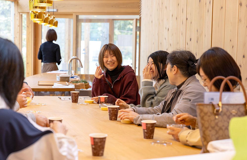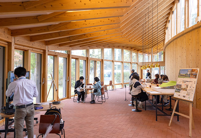 ロハス工学の研究成果と実証試験設備が盛り込まれたロハスの森「ホール」は、やさしい光につつみこまれており、訪れた人たちは、コーヒーを飲んだり、焼きたてクロワッサンを食べたりしながら、ロハスの森「ホール」がかもし出す幻想的な雰囲気を楽しんでいました。