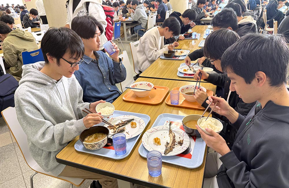 和7年10月29日(水)・30日(木)学生食堂にて『工学部校友会Day』を開催いたしました。本イベントでは、工学部校友会から提供いただきました「さんま(200匹)」と、学食トレイ広告還元を合わせて、各日100食限定メニュー「さんま豚汁定食」を特別価格200円で提供しました。