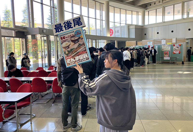 当日は体育会・学術文化サークル連合会の学生に手伝ってもらいました。食券販売開始前に多くの学生が行列を作り、12時からの販売開始とともに完売になりました。今回の企画は、工学部校友会による「さんま」の提供並びに「株式会社キャリタス様」、「株式会社仙建工業様」による学食トレイ広告収入によって実現したものです。御支援御協力いただいた皆さまに深く感謝申し上げます。
