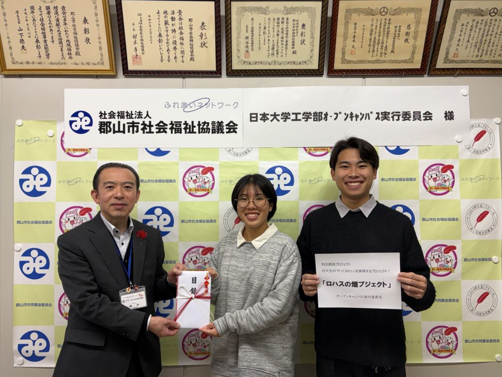 12月16日(火),オープンキャンパス実行委員会の小松﨑諒真さん(土木工学科3年)と鈴木ひかりさん(建築学科3年)が,郡山市社会福祉協議会を訪問し,キャンパス内の「ロハスの畑」で収穫したさつまいもの収益金45,000円を,郡山市共同募金委員会へ寄付しました。