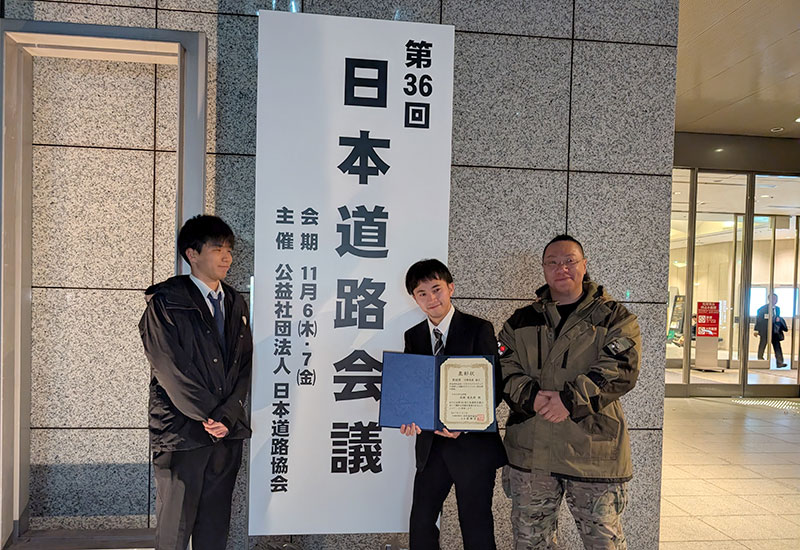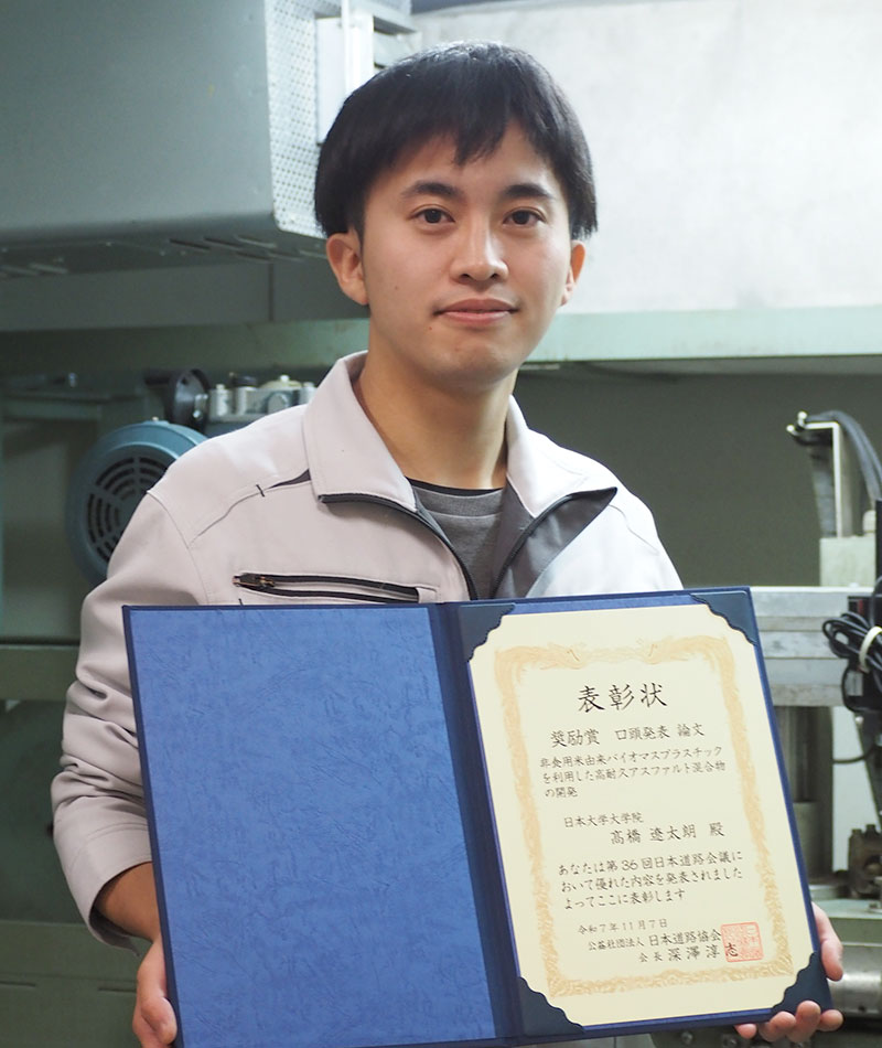 第36回日本道路会議(公益社団法人日本道路協会主催)において、土木工学専攻博士前期課程2年の髙橋遼太朗さん(道路工学研究室/前島拓准教授)が奨励賞を受賞しました。この会議は2年に一度開催される貴重な機会で、奨励賞は35歳以下の若手研究者を対象とし発表者の1割のみが受賞できる狭き門です。髙橋さんが発表した『非食用米由来バイオマスプラスチックを利用した高耐久アスファルト混合物の開発』は産官学連携による研究成果であり、将来性と発展性が期待できる研究として高く評価されました。