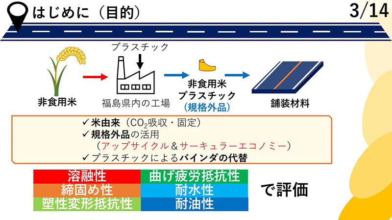 簡単に言うと、食用に適さない古くなったお米などを原料としたバイオマスプラスチック「ライスレジン®」を、道路のアスファルト混合物に添加剤として混ぜる研究です。お米に着目した背景には、福島県の復興支援があります。東日本大震災後、福島県内では風評被害によって、作っても食べてもらえないお米や、耕作放棄地となってしまった田んぼが課題となっていました。それらを「食べるため」ではなく「工業製品の材料」として活用することで、農業の経済循環を支えようという目的がありました。さらに、植物は成長過程でCO2を吸収・固定化するため、道路舗装のカーボンニュートラル実現にも大きく貢献できます。日本のCO2排出量の約18%が道路交通関連と言われる中で、これは非常に大きな意味を持ちます。また、研究・開発が活発化する中、アスファルトの耐久性が向上することも明らかになってきています。