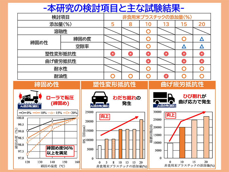 本研究では、非食用米由来バイオマスプラスチックの分量を変えてアスファルトに混合した供試体をつくり、どの程度の割合で混ぜれば道路としての性能が向上するのか、最適な添加量について検証しました。非食用米プラスチックにはポリエチレン(PE)に非食用米50%含有した50-PEとポリプロピレン(PP)に非食用米70%含有した70-PPがあり、予備実験の結果、適用性の高い50-PEを使って本試験を行いました。