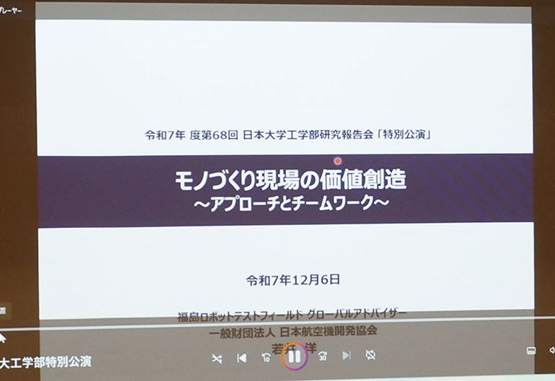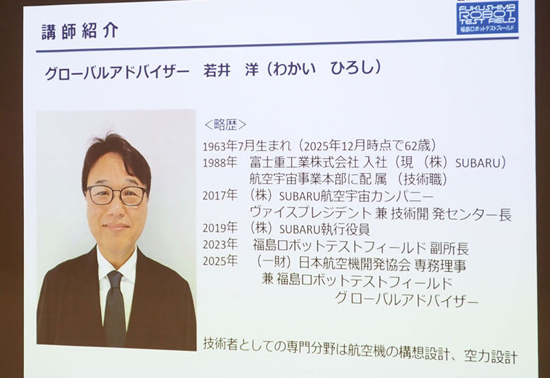 続いて、一般財団法人 日本航空機開発協会(JADC) 専務理事であり、福島ロボットテストフィールド グローバルアドバイザーでもある若井 洋氏から、動画によるご講演をいただきました。