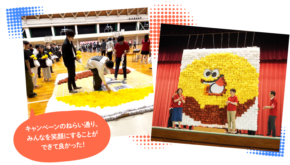 隣接する日本大学東北高等学校とのコラボで郡山での開催が実現!当日は理事長・学長も来訪され、「マリちゃん、シンちゃんコール」とともに会場へ。林理事長の「ドーナツで楽しみながら、みんなで盛り上がりましょう!」の掛け声で会場のテンションはMaxに!高校生・大学生が協働で準備した「モザイクアート」に参加者一人ひとりがペーパーフラワーを添えてスマイルドーナツを創り上げました。