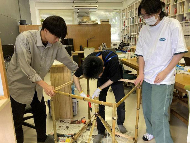 2023年は村制100周年記念イベントとして、天候に左右されない様に、屋内への能舞台の計画・設計並びに設置を行いました。また、能の演⽬「⽻⾐」の中で天⼥が⾐を松の木に掛けるための「松の立木台」と呼ばれる大変重要な小道具の制作を⽵の加工経験のある機械工学科の杉浦隆次教授とサステナブルマテリアルデザイン研究室にお願いしました。研究室の学生にとっては初めての試みでしたので試⾏錯誤はあったと思いますが、完成した「松の立木台」は能楽師の方にも大変好評で、舞台演出に華を添える形となりました。