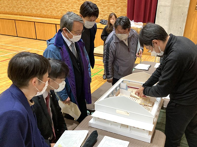 舞台設置会場にて、村・イベント関係者、能楽師に能楽空間を起案して打合せする様子(右:浦部)