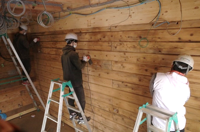 法と対比的なデザインとして、こちらもまちの雰囲気を変えられる様な特徴を持たせています。この建築は、東日本大震災の時、私や浦部研究室の当時の学生もメンバーであったログハウス型仮設住宅建設チームでつくった二本松市内の仮設住宅2棟を移設再利用したもので、2層に積み上げてつくられています。この移設再利用が、持続可能な建築そのものであり、ロハス工学の実践として意義深いと思いますが、木工事の後、研究室の学生たちがログ磨きを担当してくれ、新品さながらにピカピカに磨きあげてくれました。Ⅱ期工事全体は未だ途中ですが、今後も、そういった工学や建築的なものでなくても、ここを訪れる方たちが、ロハスな体験が実感できる