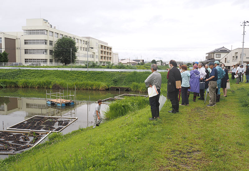 そこで、実際に状況を見ていただくために、7月12日(金)、産学官民による古川池の現地視察が行われました。郡山市からは村上一郎副市長をはじめ、建設部長や河川課職員と河道掘削工事を行う工事関係者、古川池愛護会からは髙橋晋也会長をはじめ地元住民及び企業の方々約10名、そして工学部からは土木工学科の手塚公裕准教授と環境生態工学研究室及び課外講座「ロハスの池プロジェクト」の学生7名が参加。