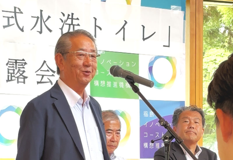 9月11日(木)、「完全自立型移動式水洗トイレ」の完成プレス披露会が工学部キャンパスで行われ、会場となったロハスの森「ホール」には関係者や報道機関各社が集まりました。福島イノベ事業創出支援課長 櫛田賢治氏が司会を務め、初めに同機構専務理事の戸田光昭氏がご挨拶しました。戸田専務理事は、移動式トイレが全国各地で導入されているものの、断水時の対応や汚物の処理などの課題があり十分に活用できていない状況に触れ、「福島イノベが令和4年度から支援してきた成果として、既存のインフラから独立した移動式の洋式水洗トイレが待望の完成披露の日を迎えたことを光栄に思う」と述べるとともに、このトイレは日本に留まらず世界中に需要があると強調されました。