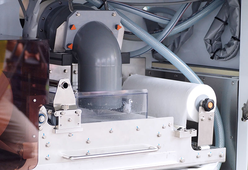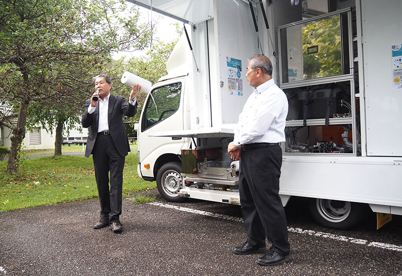 その後、駐車場に移動し、実際に「完全自立型移動式水洗トイレ」をご覧いただきながら、開発者の中野教授、神奈川トヨタ自動車株式会社執行役員 松本隼人氏からシステム等の技術面について説明を行いました。普通免許で運転できるダイナカーゴに搭載されたトイレの車載構造について、トイレを車両の両端に配置し中央にろ過装置を設置することで、プライバシーに配慮した設計になっていると松本氏が説明。浄化システムについては、実際に稼働させながら中野教授が解説しました。水洗トイレで流した後、まず汚水を固形物と水に分けて処理します。水は3層の活性炭フィルターで色素と臭気を除去し、塩素錠剤を入れた再生水タンクに貯留、その後、循環して使い続けることができます。固形物は不織布のロールで巻き取り、一般の人でも簡単に取り替えることができるため、汲み取り式と比較して汚物量は12分の1以下に減容、これまでのトイレのように汚物のタンクが満タンになって使えなくなる心配もありません。