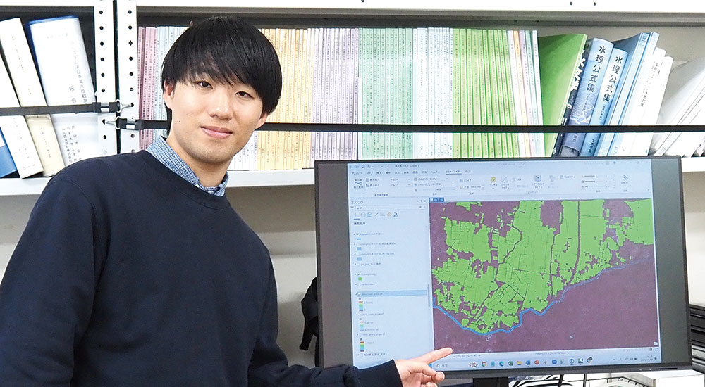 人工衛星データとGIS(地理情報システム)を用いた河川氾濫地点の特定の研究を行っています。インドネシアとオランダでの現地調査を経験し、河川のスケールの大きさを実感しました。インドネシアは河川の氾濫が頻繁に起こる地域、オランダは整備が進んでいる地域での調査だったので、対比しながら河川整備の重要性を学ぶことができました。
